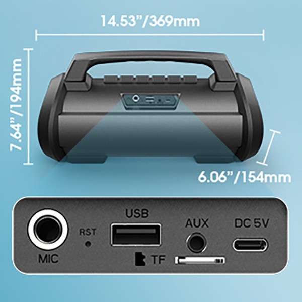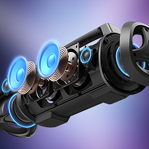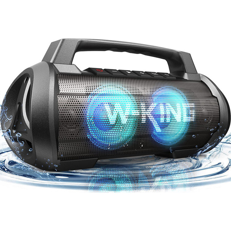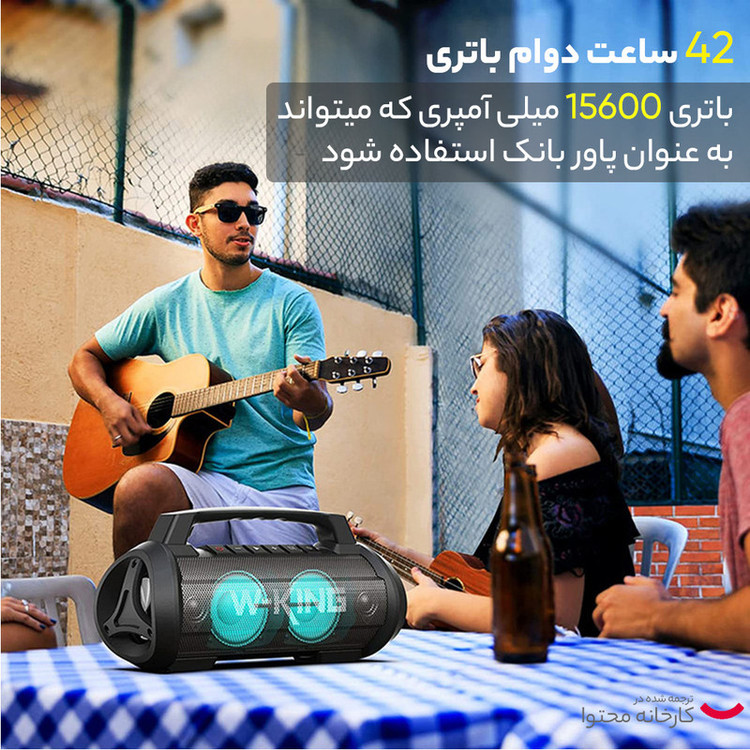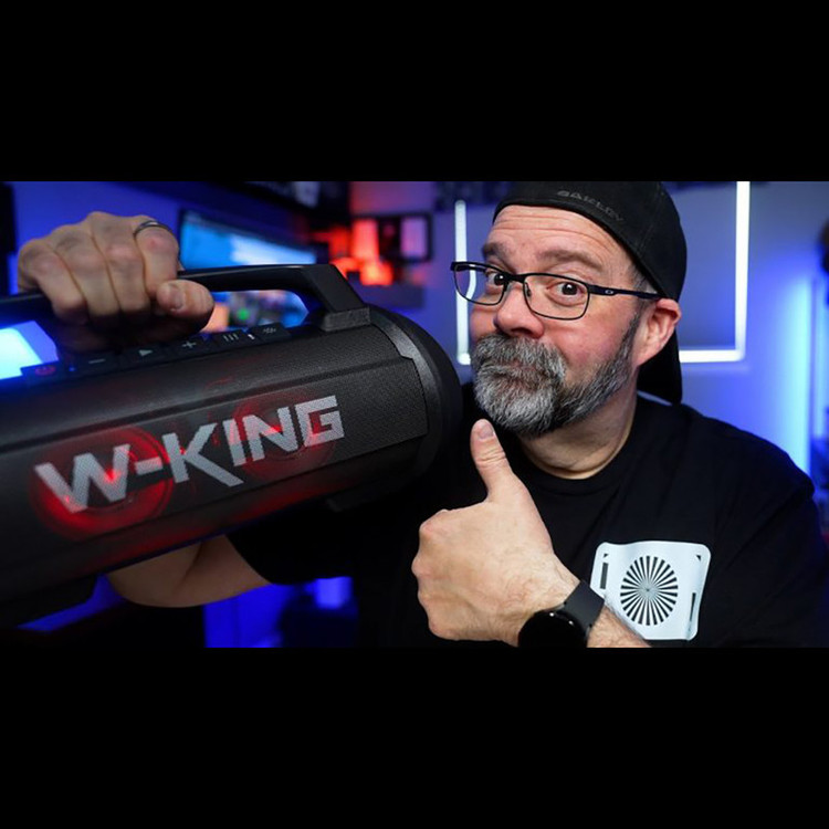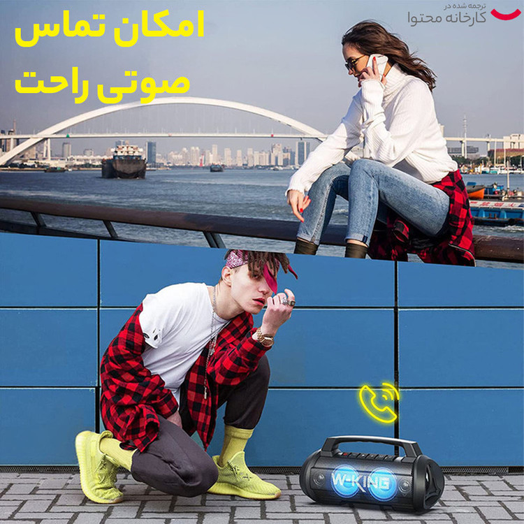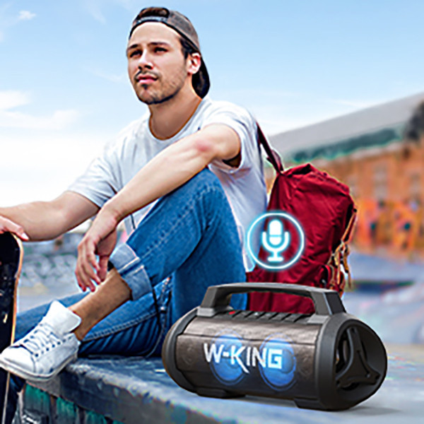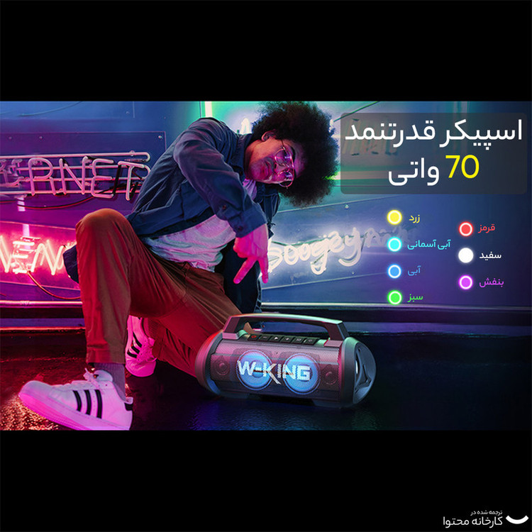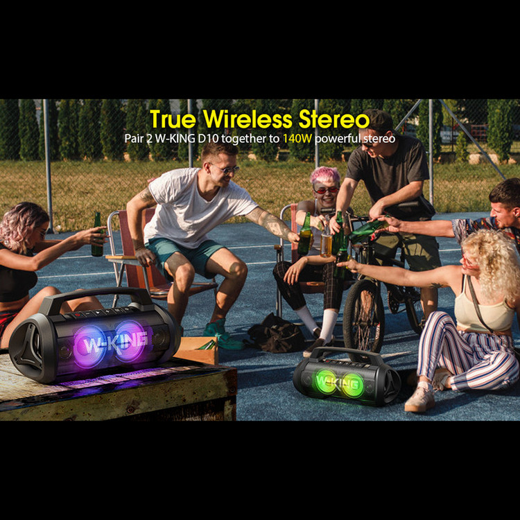 اسپیکر W-King D10 ، یک اسپیکر 70 واتی با قابلیت اتصال به یک D10 دیگر (پشتیبانی از TWS)، باتری 13200 میلی آمپر ساعتی و امکانات دیگر مثل نورپردازی و استاندارد IPX6 انتخاب خوبی برای کسانی است که به دنبال اسپیکر با کیفیت هستند تا بتوانند همه جا از آن استفاده کنند. اسپیکر W-King D10 به گونه ای طراحی شده است تا بتوانید در محیط های مختلف از آن استفاده کنید. برای جابه جایی آن یک دستگیره تعبیه شده تا در کنار زیبایی در حمل و نقل آن مشکلی نداشته باشید. ابعاد اسپیکر برابر 36.9x19.4x15.4 سانتیمتر و وزن آن برابر 3 کیلوگرم است. روی اسپیکر بلوتوث دبلیو کینگ D10 یک حلقه نورپزدازی RGB قرار دارد که می تواند با ریتم موسیقی هماهنگ شود. اسپیکر بلوتوث دبلیو کینگ D10 با دو عدد woofer و دو عدد tweeter حداکثر توان خروجی 70 وات ارائه می دهد. یکی از ویژگی های این اسپیکر پشتیبانی از قابلیت TWS است که می توانید دو عدد از این اسپیکر را توسط بلوتوث به هم متصل کنید. در این صورت صدا به صورت استریو با توان بالاتری پخش می شود. اسپیکر W-King از استاندارد IPX6 پشتیبانی می کند که به معنی مقاومت در برابر پاشش آب است. این اسپیکر دارای تماس بلوتوثی است و با استفاده میکروفون داخلی می توانید مکالمه کنید بدون اینکه نیاز باشد ارتباط را قطع کنید. برای اتصال به اسپیکر W-King D10 شما می توانید از طریق بلوتوث، جک AUX، فلش مموری یا micro SD موسیقی خود را پخش کنید. اسپیکر بلوتوث دبلیو کینگ D10 نسخه 5.0 است که باعث اتصال سریع و پایدار می شود. این اسپیکر از فرمت های مختلف صوتی از جمله MP3, WAV, WMA, APE و FLAC پشتیبانی می کند. اسپیکر بلوتوث دبلیو کینگ D10 دارای درگاه اتصال میکروفون سیمی 6.35 میلیمتر است و شما می توانید میکروفونتان را به صورت سیمی به این اسپیکر متصل کنید. اسپیکر W-King D10 دارای باتری با ظرفیت 13200 میلی آمپر ساعت است تا در محیط داخل و فضای باز شارژدهی بالایی داشته باشد. بسته به استفاده شما و میزان حجم صدا تا 42 ساعت می تواند شارژدهی داشته باشد. این اسپیکر می تواند به صورت پاوربانک میز مورد استفاده قرار بگیرد و گوشی خود را با اتصال به آن شارژ کنید. اسپیکر W-King D10 دارای پنل کنترل کاملی است تا به راحتی بتوانید موسیقی و عملکرد دستگاه را کنترل کنید.