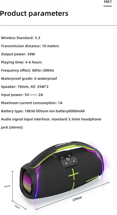 • اسپیکر HOPESTAR H61 معمولاً دارای باتری با ظرفیت بالا است که امکان استفاده مداوم برای چند ساعت (معمولاً بین 8 تا 12 ساعت) را فراهم می آورد.