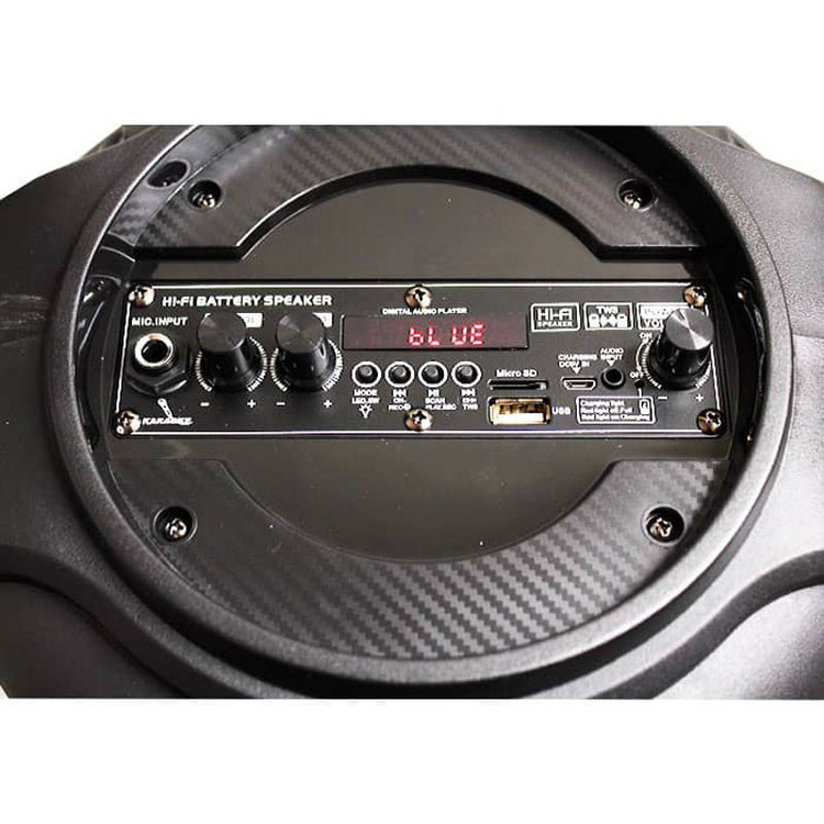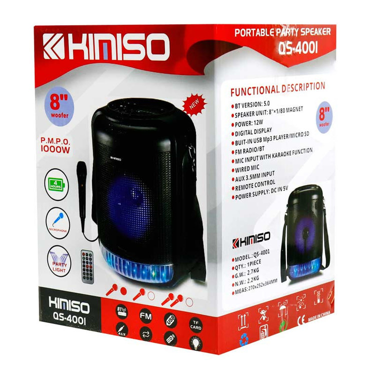 اسپیکر چمدانی مدل QS4001 برند کیمیسو با طراحی شیک و خوش ساخت از کیفیت پخش صدای خوبی نیز برخوردار است که حتی در محیط های شلوغ و پر سروصدا می تواند صدایی واضح و با بیس بالا را به گوش برساند. این دستگاه پخش کننده صوتی از متریال باکیفیتی ساخته شده که استحکام کافی را در برابر آسیب های احتمالی خواهد داشت، همچنین باتوجه به اینکه ابعاد بزرگی دارد، محفظه ای در پشت به عنوان دستگیره و یک بند برای آن درنظر گرفته شده تا حمل و جابجایی برای کاربر راحت تر انجام شود. نورپردازی داخلی LED نیز در بخش بلندگو و پایین پنل فراهم شده که در هنگام پخش موسیقی به خصوص در محیط های تاریک، زیبایی و جذابیت آن را دوچندان خواهد کرد. یک نمایشگر LED و دکمه های فیزیکی در بالای این اسپیکر پرتابل قرار گرفته تا مدیریت بر روی بخش های موسیقی، تنظیم حجم صدا و … در دسترس کاربر باشد. اسپیکر پرتابل میکروفن دار کیمیسو QS-4001 از اتصال بی سیم پشتیبانی می کند و از طریق بلوتوث نسخه 5٫0 به گوشی موبایل، تبلت، لپ تاپ و دیگر دستگاه ها متصل می شود و تا شعاع 10 متری این اتصال پایدار باقی می ماند. این پخش کننده صوتی علاوه بر جفت شدن به صورت بی سیم به رابط جک صوتی 3٫5 میلی متری (AUX)، پورت فلش مموری USB و شیار رم میکرو SD نیز مجهز می باشد تا روش های بیشتری برای دسترسی به فایل های صوتی در اختیار کاربر قرار بگیرد. از ویژگی های کاربردی این اسپیکر بلوتوثی، مجهز بودن به ورودی میکروفون است که علاوه بر ضبط صدا با اتصال میکروفون همراه این دستگاه، امکان استفاده از آن در سخنرانی ها، همخوانی با آهنگ ها، تمرین آواز خواندن و … نیز برای کاربر فراهم خواهد بود. اسپیکر چمدانی بلوتوثی رم و فلش خور کیمیسو مدل QS4001 با درایو 8 اینچی و توان خروجی 12 واتی می تواند صدایی قدرتمند با تمام جزئیات زیر و بم موسیقی را پخش کرده و با صدا را به صورت استریو با پاسخ فرکانسی مطلوب به گوش کاربر برساند. منبع انرژی موزیک پلیر بلوتوثی کیمیسو توسط باتری داخلی لیتیومی تامین می شود که از ماندگاری شارژ مناسبی برخوردار است و برای استفاده مداوم با بلندی صدای متوسط می تواند در حدود 4 ساعت دوام بیاورد. خود باتری نیز درصورت اتمام شارژ از طریق پورت میکرو یو اس بی قابلیت شارژ دوباره را خواهد داشت.